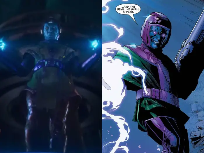 'Quantumania' 예고편에서 캉은 코믹스와 유사한 의상을 입고 있는 모습이며, 만화에서처럼 얼굴에도 세로 흉터가 있습니다.